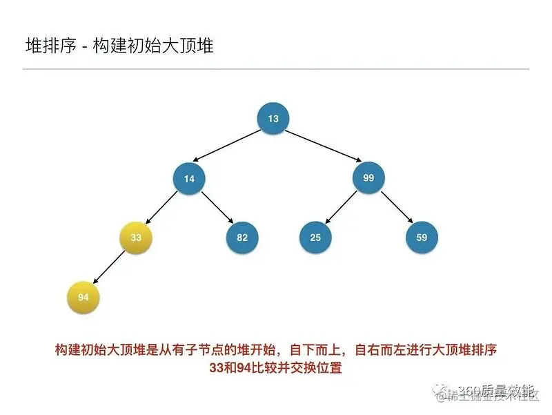 将待排序的序列构建成为一个大顶堆,其实就是从下往上,从右到左,将每个非终端结点(非叶结点)当作根结点,将其和其子树调整成大顶堆。