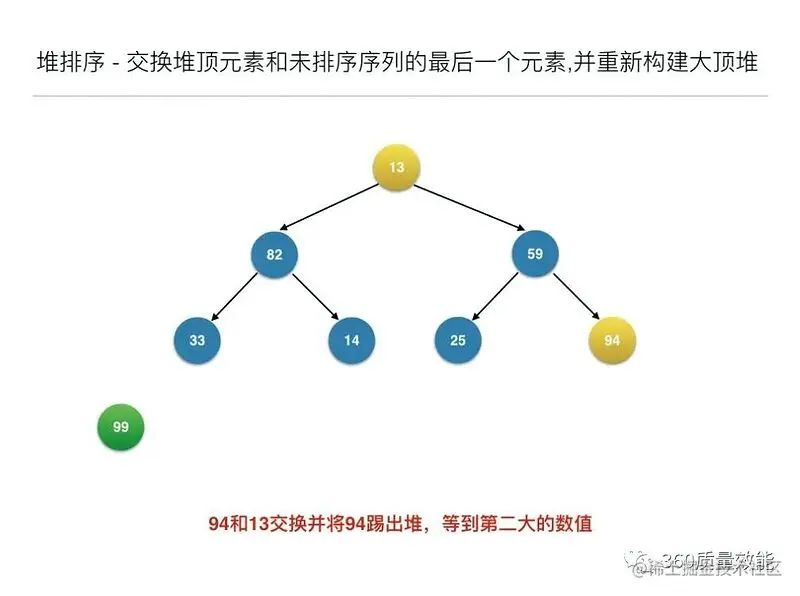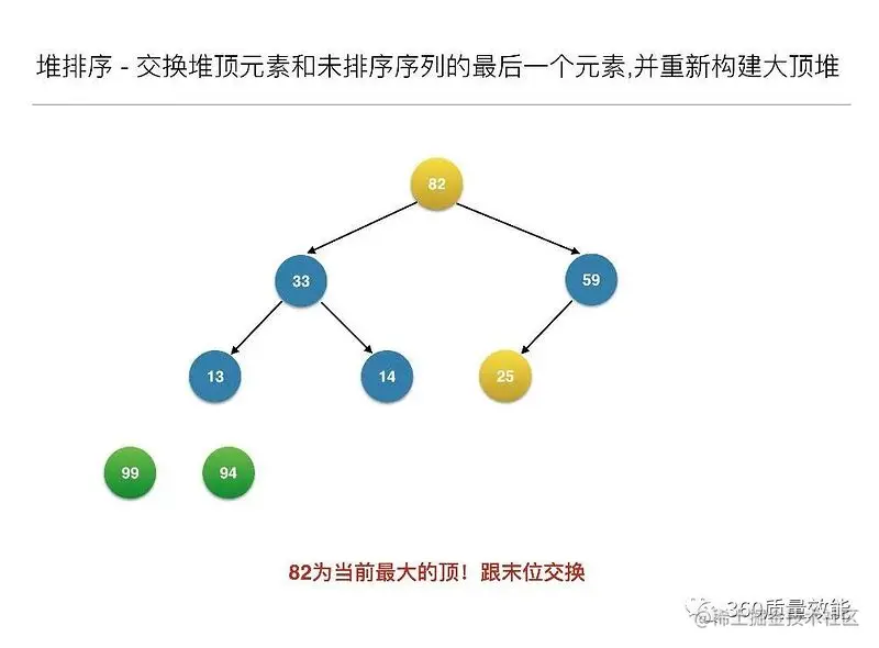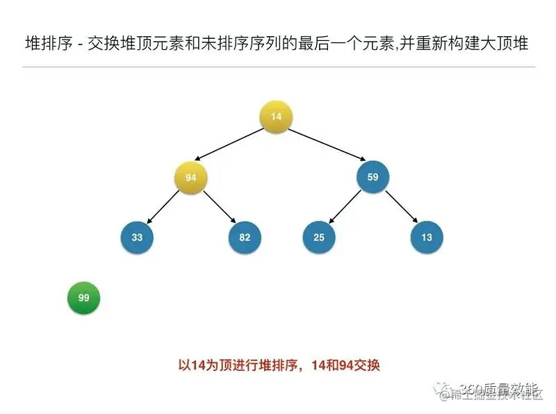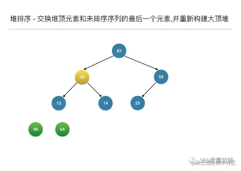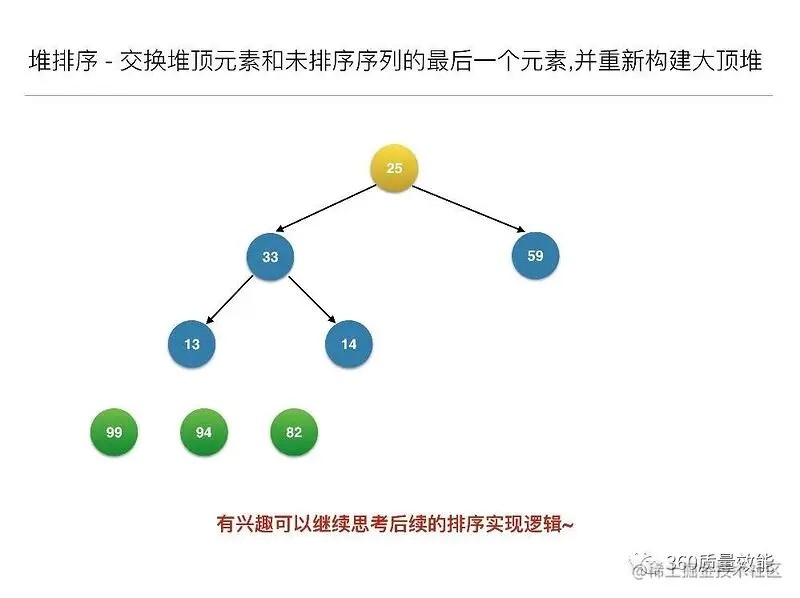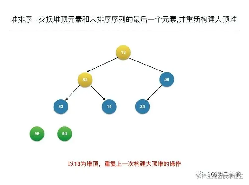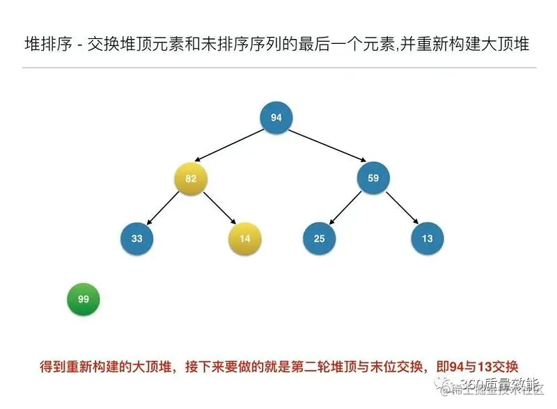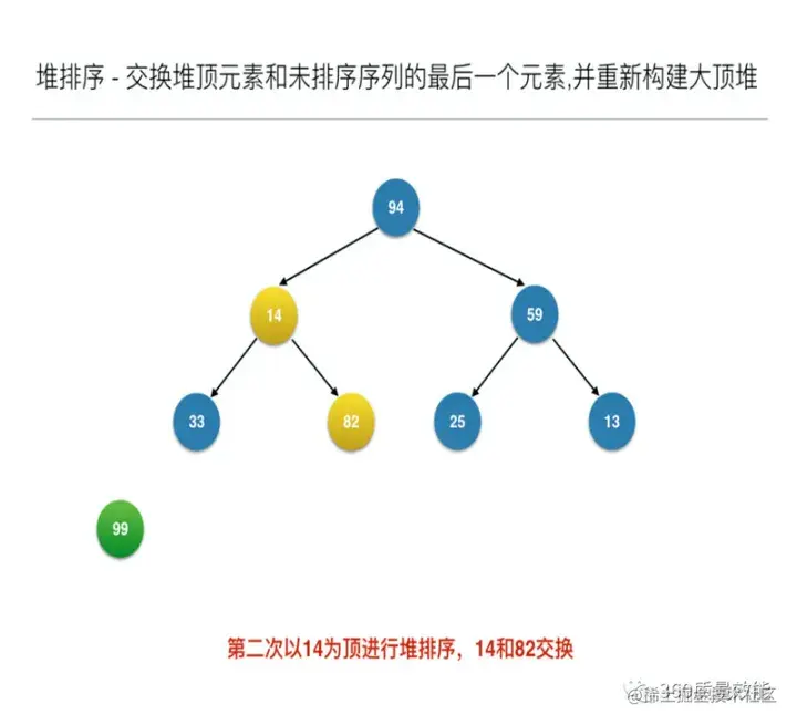 构建大顶堆之后,交换堆顶元素和未排序序列的最后一个元素,并重新构建大顶堆;