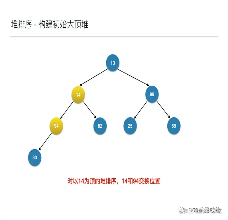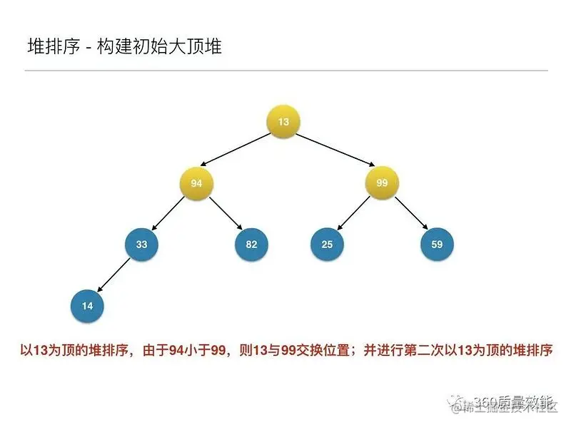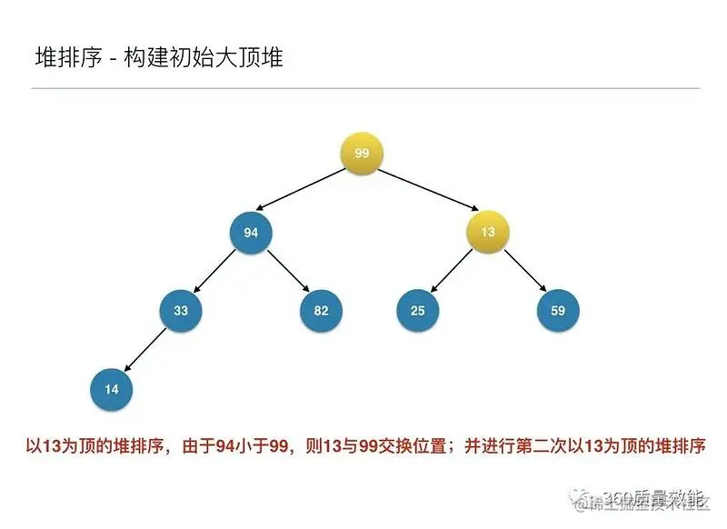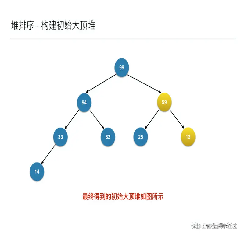 到此为止构建大顶堆的过程算是完成了,任务完成了一半。接下来就是正式的排序过程,接着来