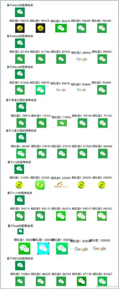 下边展示了不同方法针对一张图标,在同一数据库中进行相似图像检测的效果:
