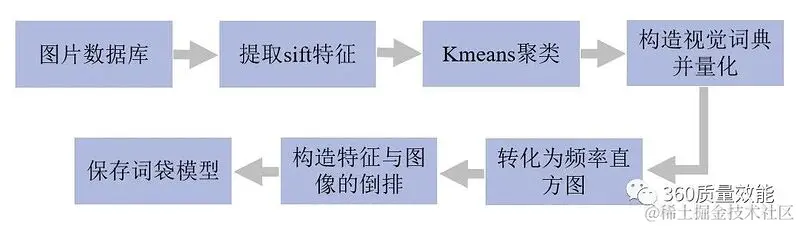 BOW模型被广泛用于计算机视觉中,相比于文本的BOW,图像的特征被视为单词(word),视觉词汇的字典则由图片集中的所有视觉词汇构成,词袋模型的生成如下图。首先,用sift算法生成图像库中每幅图的特征点及描述符。再用k-Means算法对图像库中的特征点进行聚类,聚类中心有k个,聚类中心被称为视觉词汇,将这些聚类中心组合在一起,形成一部字典。根据IDF原理,计算每个视觉单词TF-IDF权重来表示视觉单词对区分图像的重要程度。对于图像库中的每一幅图像,统计字典中每个单词在在其特征集中出现的次数,将每张图像表示为K 维数值向量(直方图)。得到每幅图的直方图向量后,构造特征到图像的倒排表,通过倒排表快速索引相关候选的图像。对于待检测的图像,计算出sift特征,并根据TF-IDF转化成特征向量(频率直方图),根据索引结果进行直方图向量的相似性判断。