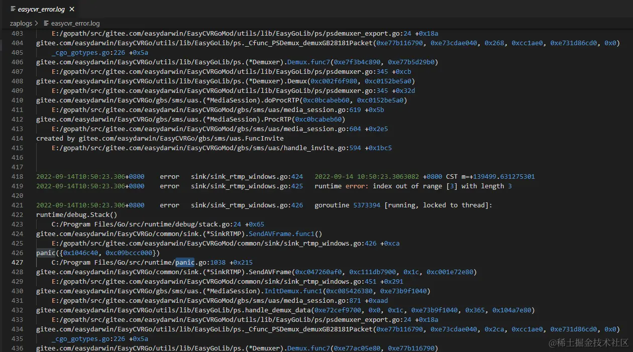 从错误日志看,是因为sink_rtmp_windows.go文件中的425行,出现数组获取超出本身的长度的问题,实际报错是在451行。