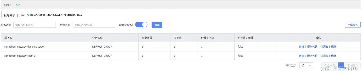 ① 启动网关服务工程(springboot-gateway-dynamic-server)和测试服务工程(springboot-gateway-client-a),查看nacos注册情况。