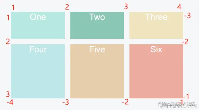 划分网格的线即为网格线。需要注意的是,我们定义网格的时候,定义的是网格轨道。Grid 会自动创建编号的网格线来定位每一个元素,m 列有 m+1 根垂直的网格线,n 行有 n+1 根水平网格线。一般而言,是从左到右,从上到下,1,2,3 进行编号排序,从右到左,从下到上,则是按照 -1,-2,-3… 顺序进行编号排下序。