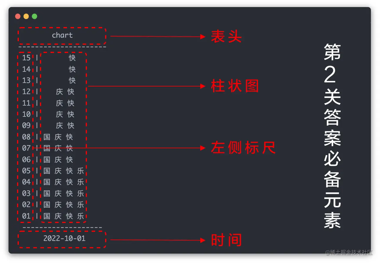 根据生成的数据,用一条SQL语句,生成柱状图,柱状图所表示的“国庆快乐”的字数要与实际生成的数据保持一致: