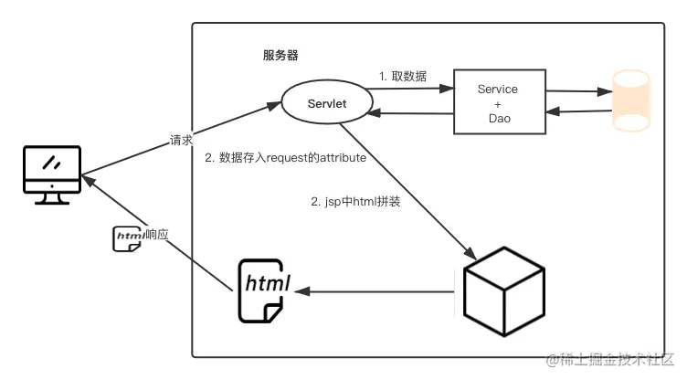JSP出现后,就可以不用一行行复制HTML代码了,而是在JSP中直接写HTML代码和Java代码,后期JSP编译成一个Servlet,通过Java代码获取后台数据后拼接到HTML片段中,最终通过out.println()输出。