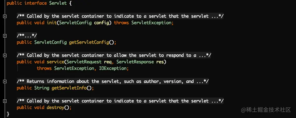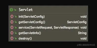 所有实现servlet的类,都需要实现接口中定义的五个方法,其中最主要的是两个生命周期方法init()和destroy(),还有一个处理请求的service(),也就是说,所有实现servlet接口的类,或者说,所有想要处理网络请求的类,都需要回答这三个问题: