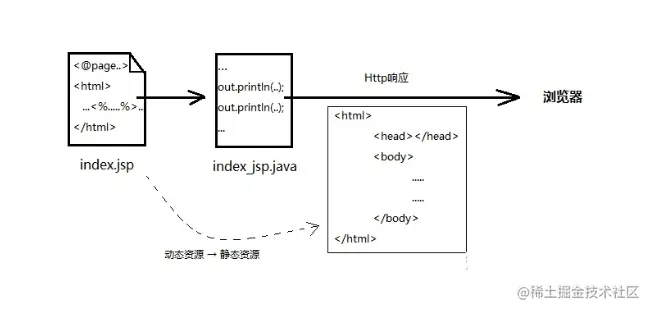 当有人请求JSP时,服务器内部会经历一次动态资源(JSP)到静态资源(HTML)的转化,服务器会自动帮我们把JSP中的HTML片段和数据拼接成静态资源响应给浏览器。也就是说JSP运行在服务器端,但最终发给客户端的都已经是转换好的HTML静态页面(在响应体里)。服务器并没有把JSP文件发给浏览器(假装重要的事情已经说3遍)。