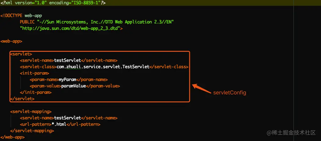 Servlet接口中定义的init方法的参数类型为ServletConfig,该对象是Tomcat生成的,我们自己实现Servlet接口时,可以直接使用该ServletConfig对象。顾名思义,该对象其实就是Servlet配置。我们是在web.xml文件中配置的servlet,也就是说Tomcat帮我们把xml文件解析为对象,供我们直接使用,免去我们使用dom4j解析xml文件的麻烦。