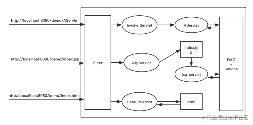 servlet是一个规范,那实现了servlet的类,就能处理网络请求了吗?答案是不能的。你可以随便谷歌一个Servlet的HelloWorld教程,里面都会让你写一个servlet,但你从来不会在Servlet中写什么监听8080端口的代码,servlet不会直接和客户端打交道!那请求怎么到达Servlet的呢?答案是servlet容器,比如我们最常用的Tomcat、Jetty。你随便谷歌一个Servlet的HelloWorld教程,里面肯定会让你把servlet部署到一个容器中,不然你的servlet压根不会起作用。Tomcat才是与客户端直接打交道的,它监听了端口,请求过来后,根据url等信息,确定要将请求交给哪个servlet去处理,然后调用那个servlet的service方法,service方法的入参都是Tomcat构造的,service方法调用结束后,response参数被赋值,通过Tomcat返回给客户端。