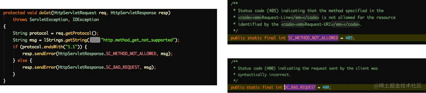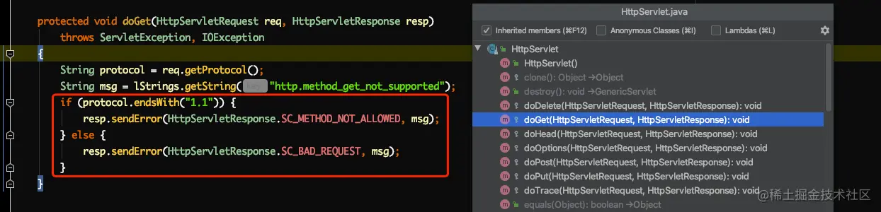如果我们没重写会怎样?那么就会调用HttpServlet自己提供的doXXX方法,进而返回Http错误的状态码。