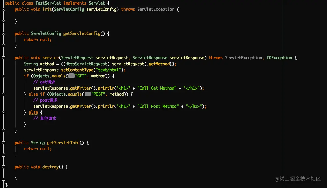 - getServletInfo:获取Servlet信息,比如作者、版本等,这个方法没有参数,我们可以自由实现