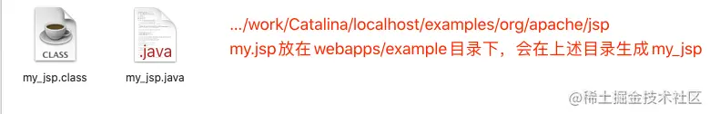 我们不妨看一下my.jsp编译后生成的java类,这里我们把my.jsp放在tomcat安装目录下……/webapps/examples/目录下,编译后会在tomcat的……/work/Catalina/localhost/examples/org/apache/jsp下生成my.jsp编译后生成的字节码class文件和java文件,名称生成规则是jsp的名称拼上”_jsp”,比如test.jsp就会生成test_jsp.class、test_jsp.java。