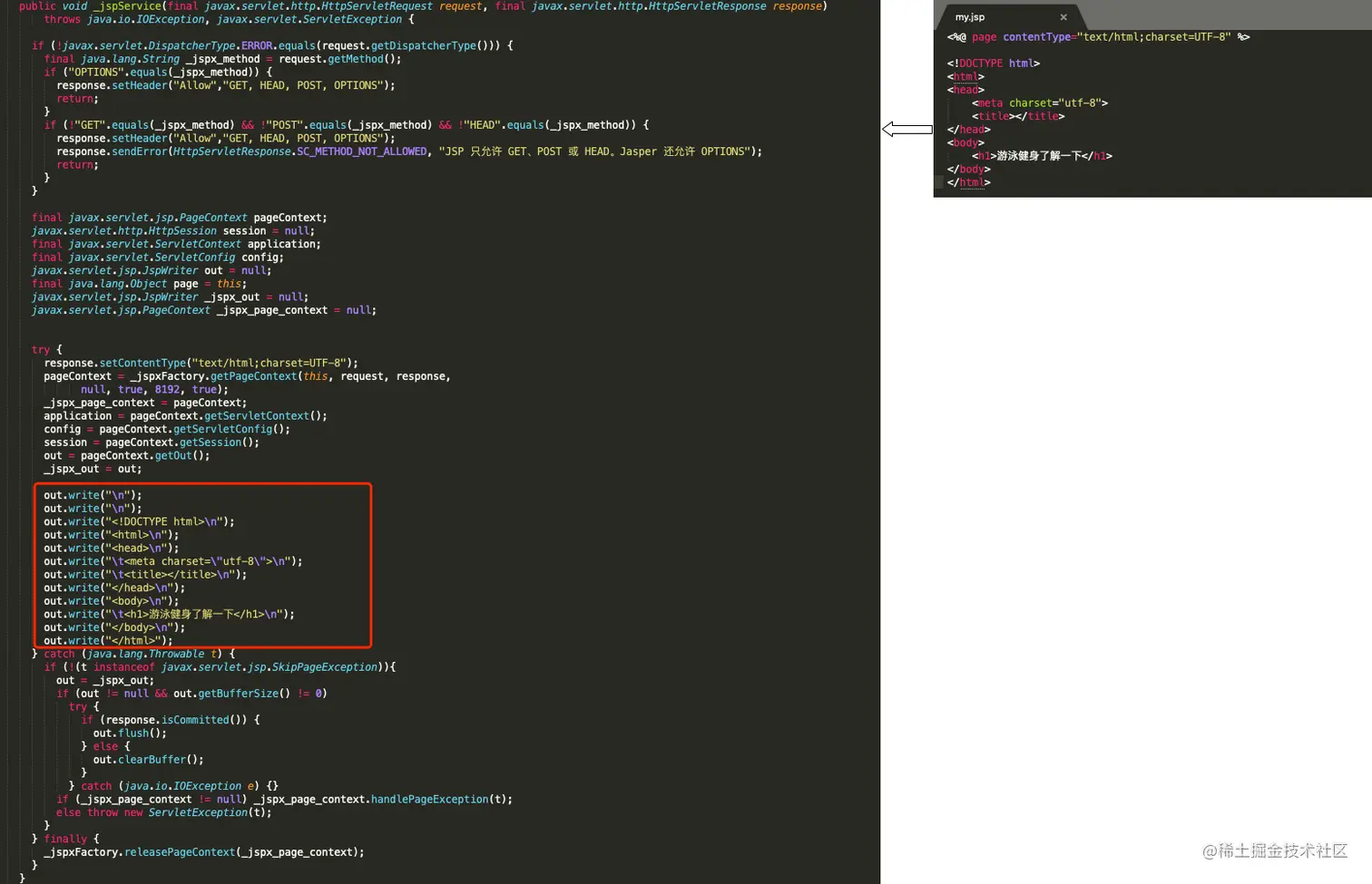 为了不让Java程序员一行行复制HTML代码到Servlet里,SUN公司干脆让Java程序员直接把HTML写在了Servlet里!但是毕竟SUN还没有那么明目张胆,让这个Servlet伪装了一把,打扮成JSP,然后跟程序员说:看,我搞了个JSP,能在上面同时写HTML和Java代码。 等你写完JSP,回头访问时,Tomcat就把这个JSP翻译成Servlet,原先写在JSP里的HTML代码就自动放在了out.println()里啦!相当于程序帮我做了“逐行复制HTML代码到Servlet”这一步。