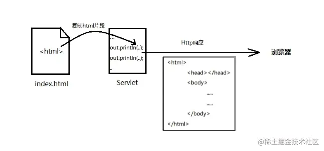 通过上面的介绍,我们知道,Servlet为了输出动态html,需要在Servlet中通过Response获取PrintWriter对象,然后调用println方法,将html输出。