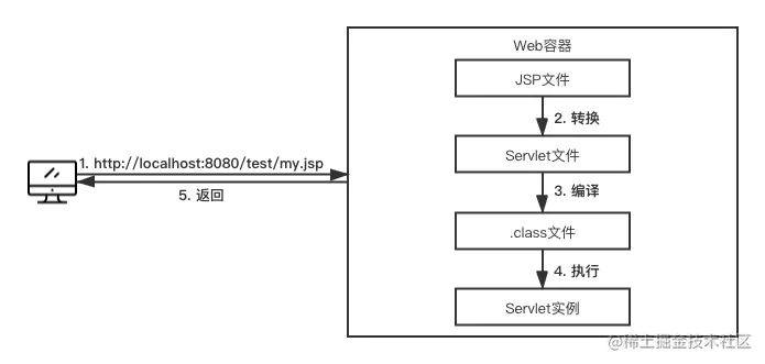 通过上面2.4.2介绍的Web容器的工作原理,我们已经清除知道Servlet的工作原理。即通过Servlet容器监听Socket网络请求,然后容器会将请求转发到对应的Servlet类,调用service方法,输出html。接下来看一下JSP的本质,其实JSP本质就是一个Servlet。具体的源码我就不带大家看了,大致流程是这样的: