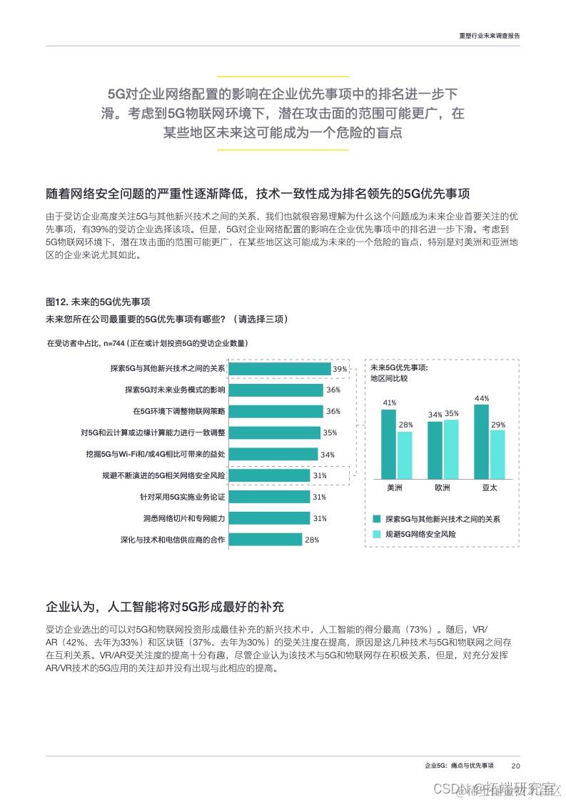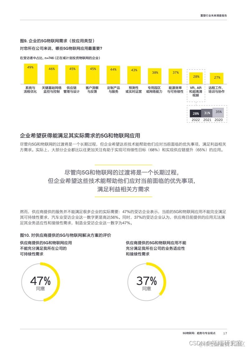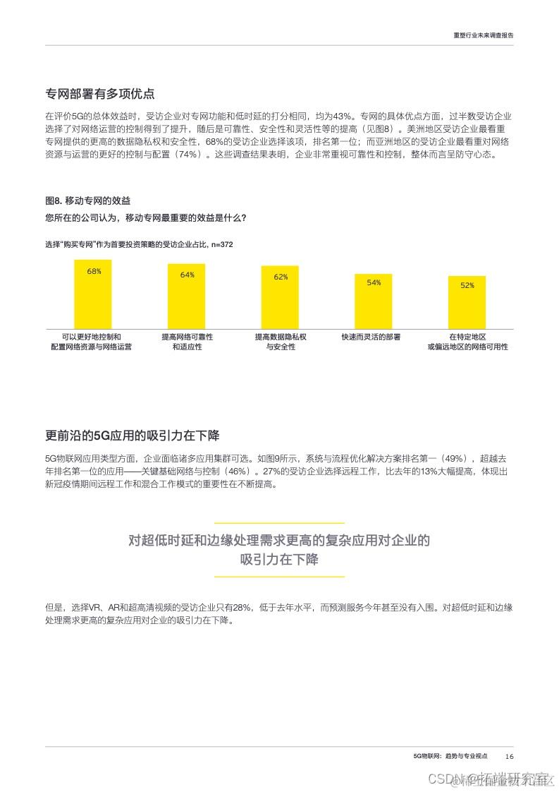 关于5G与物联网应用需求,系统与流程优化解决方案排名第一(49%),选择VR、AR和超高清视频的受访企业只有28%,低于去年水平。