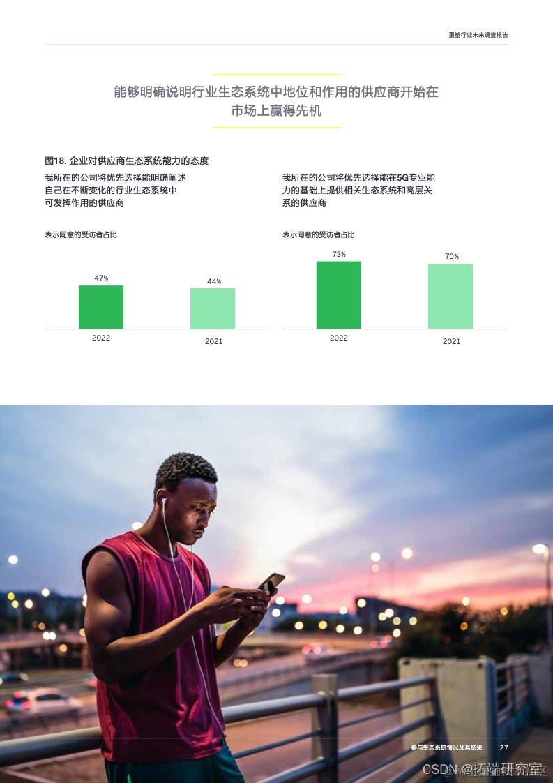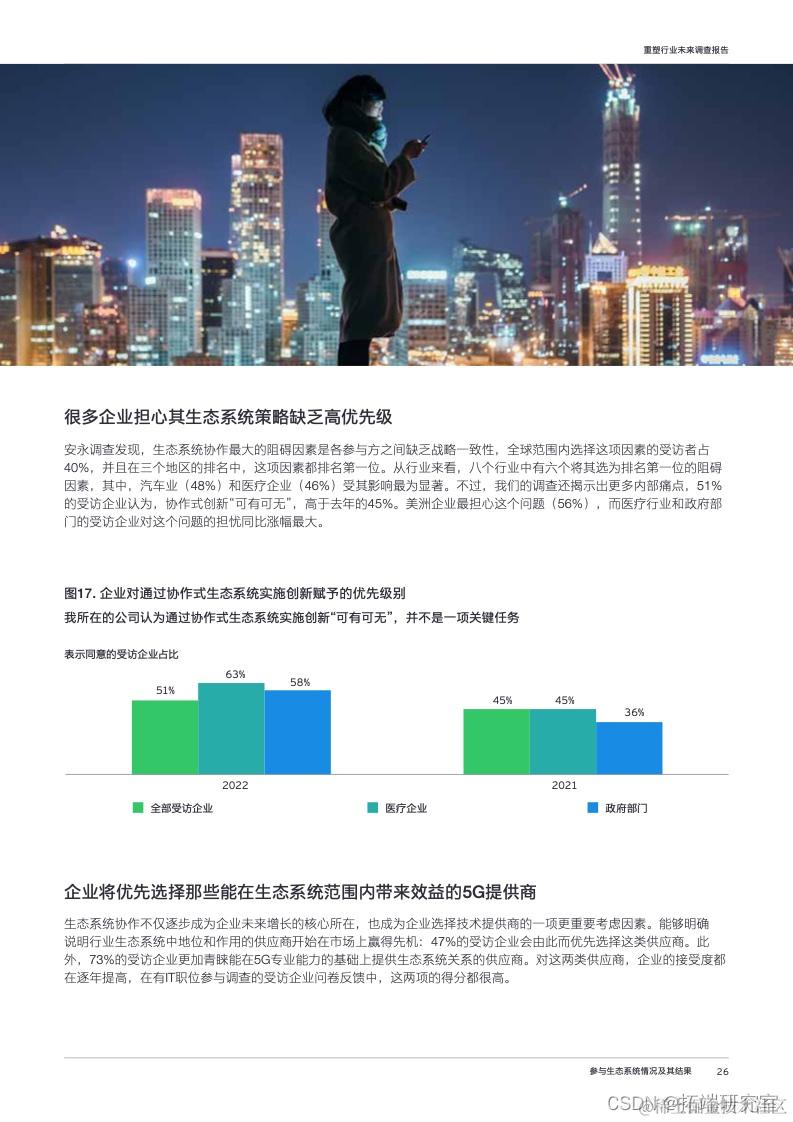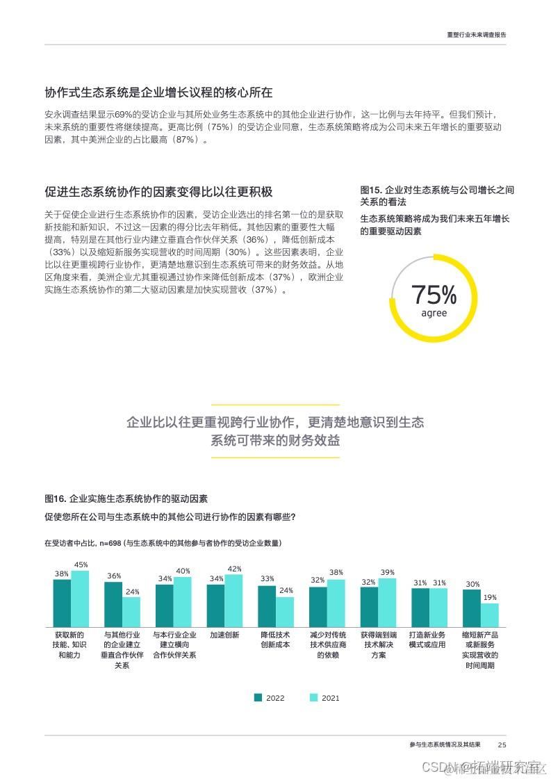 生态系统协作成为企业获得新技能和新知识的重要途径,69%的受访企业已经在其业务生态系统中与其他组织进行协作,四分之三的受访企业认为,生态系统策略将成为公司五年增长计划的核心所在。
