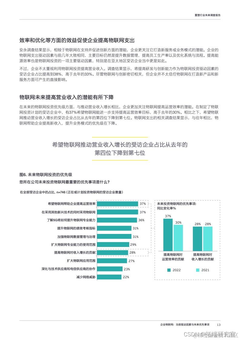 关于5G与物联网投资驱动因素,受访企业表示,与促进收入提升相比,他们更重视提升运营效率和流程优化。