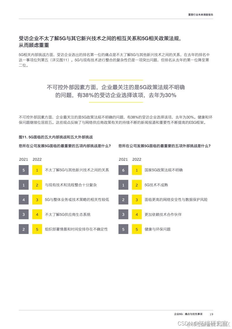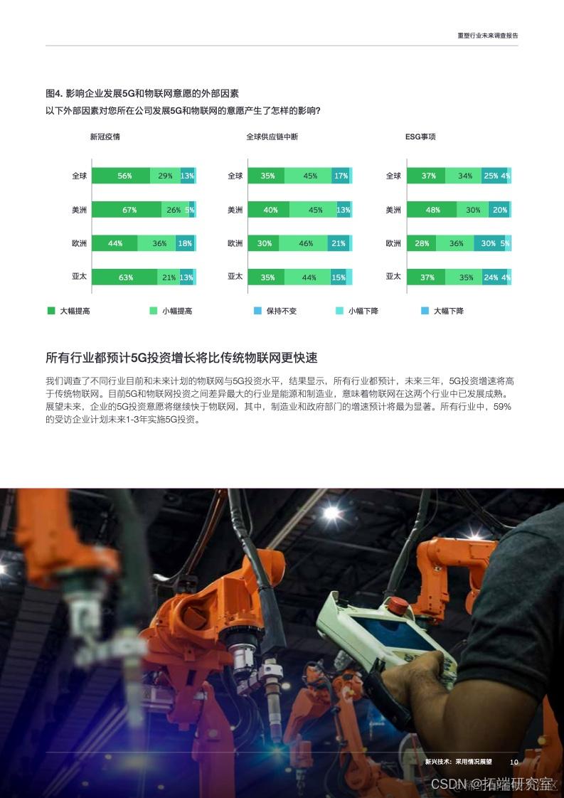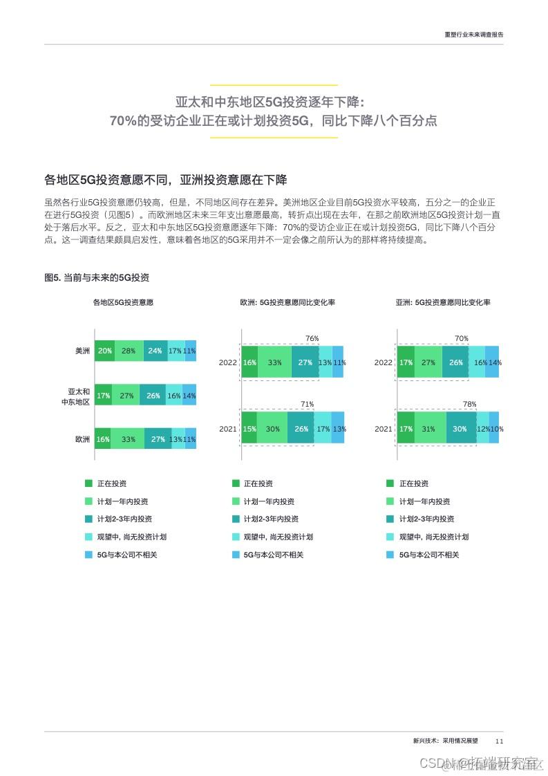 分地区来看,不同地区间存在差异。安永调查结果显示,70%的亚洲和中东地区的企业有意投资5G,但低于去年的78%。技术提供商应当认识到,尽管5G日益成为主流,但有些企业对5G的接受度可能不升反降。