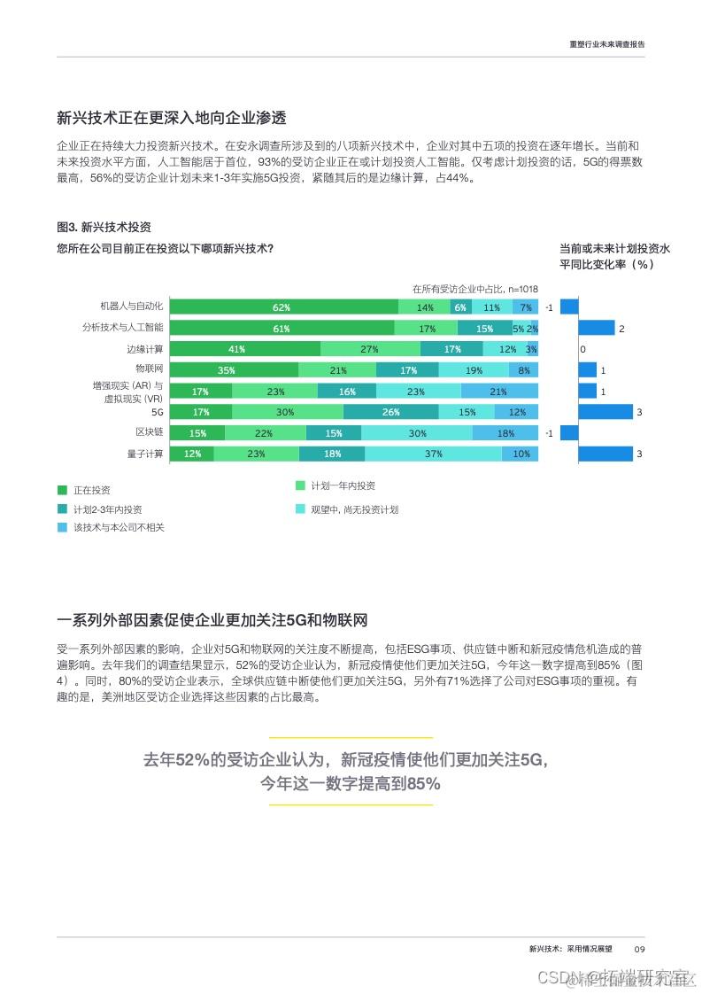 企业正在持续大力投资新兴技术,在未来支出意愿方面,5G处于领先。新冠肺炎疫情、供应链中断以及环境、社会与治理(ESG)事项等诸多相互关联的外部因素促使企业愿意提高5G和物联网支出。