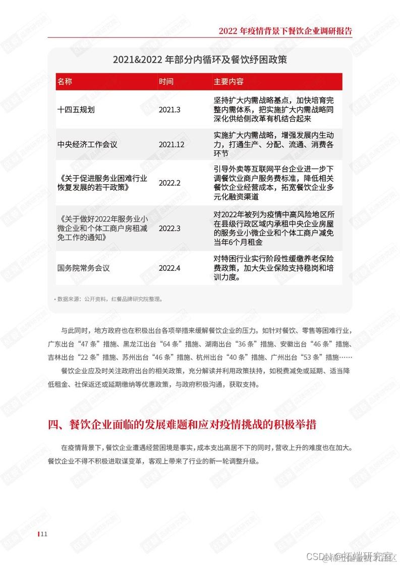 基于此,疫情暴发伊始,政府部门就高度关注餐饮行业发展和行业诉求。目前,中央和地方均陆续出台了一系列支持性政策,尤其是进入2022年以来,针对餐饮行业的各项纾困政策纷纷出台,助力包括餐饮企业在内的中小企业共渡难关。