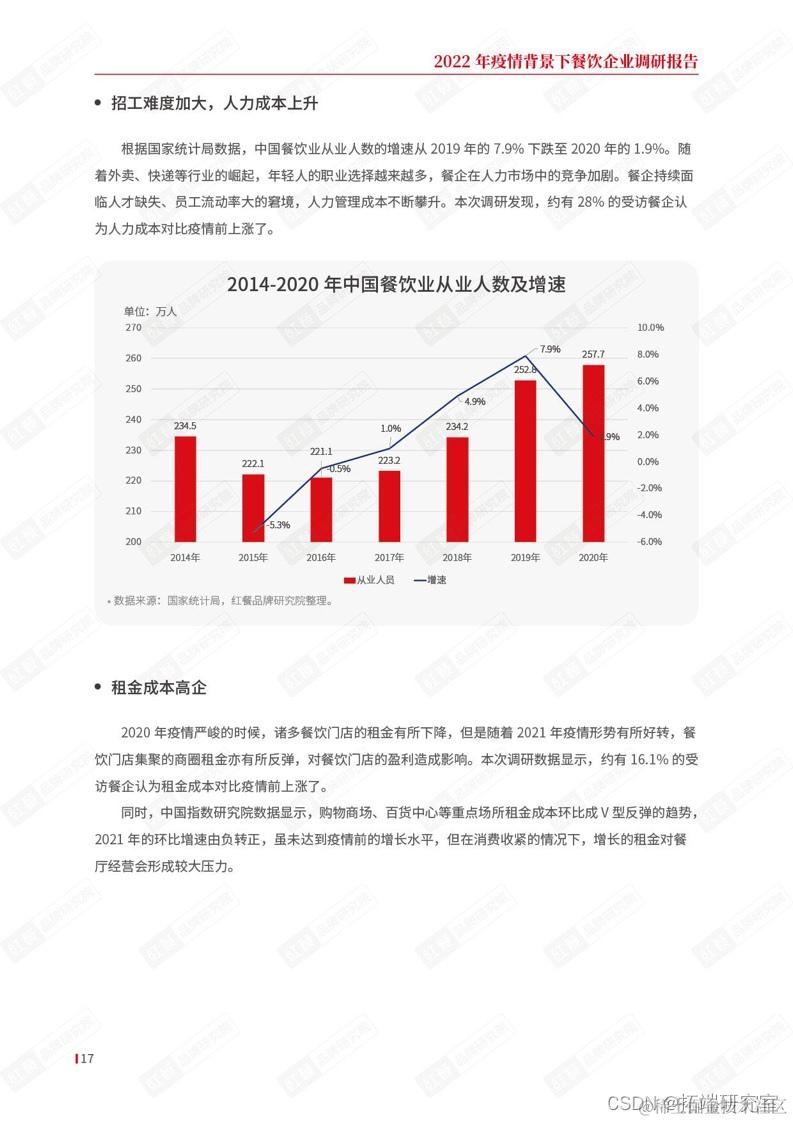 调研显示,受访餐企2021年的成本相比2019年上升了17.1%;有超过6成的受访餐企认为目前的主要困难是门店租金、原材料成本和人力成本上升趋势。