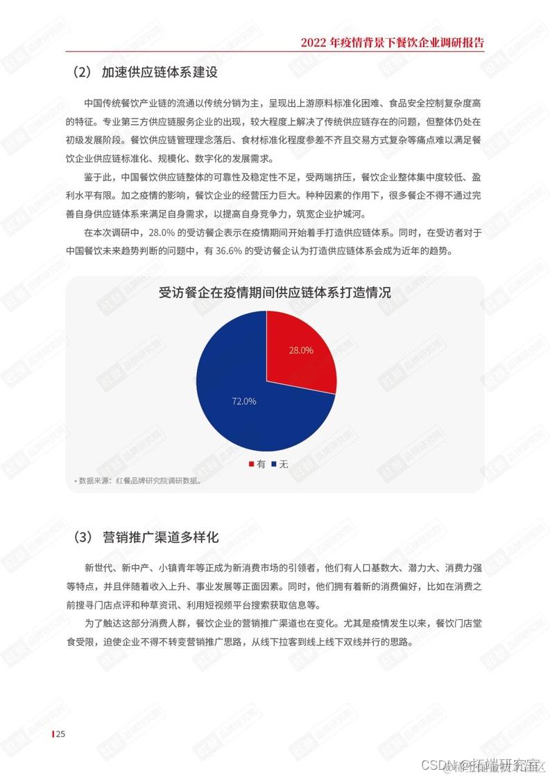 在本次调研中,28.0%的受访餐企表示在疫情期间开始着手打造供应链体系。同时,在受访者对于中国餐饮未来趋势判断的问题中,有36.6%的受访餐企认为打造供应链体系会成为近年的趋势。