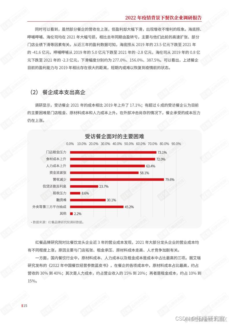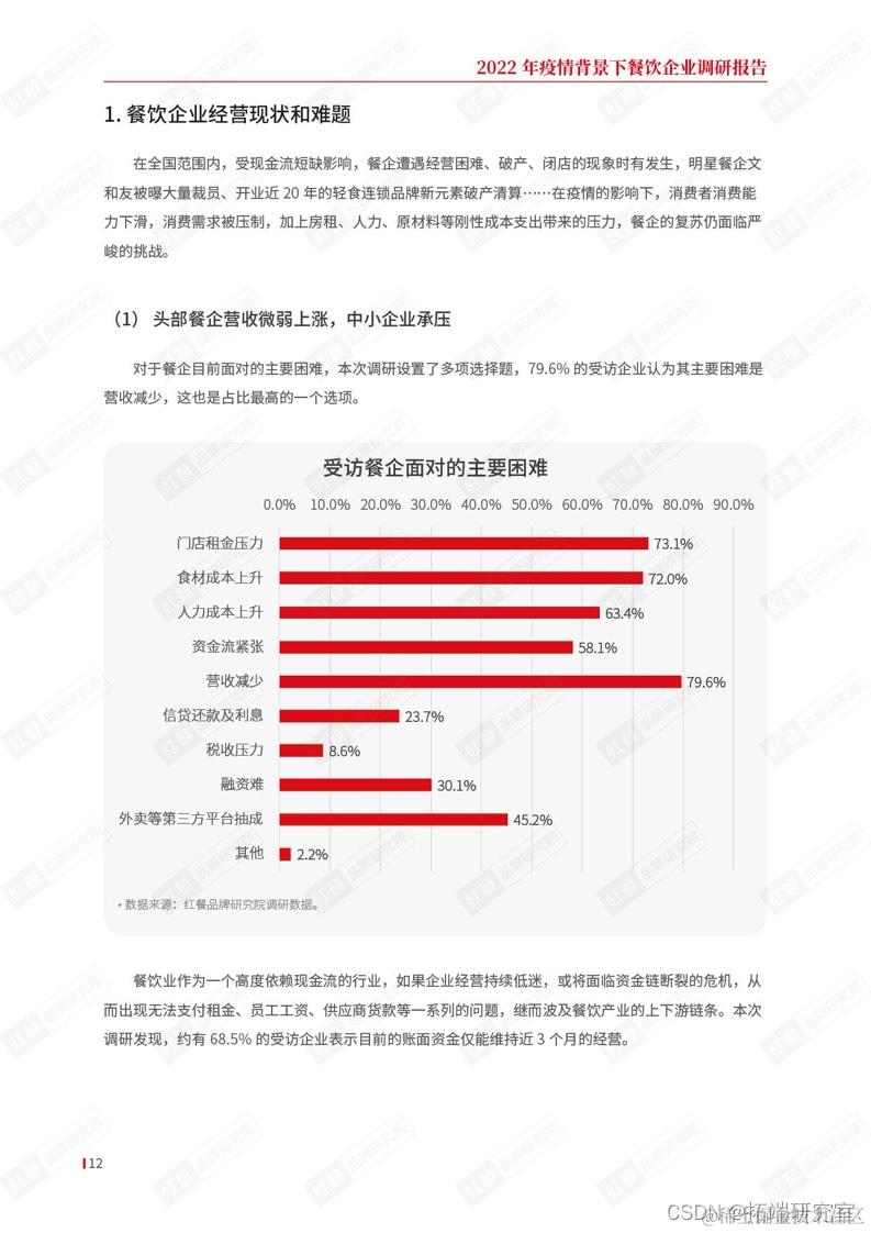 对于餐企目前面对的主要困难,本次调研设置了多项选择题,79.6%的受访企业认为其主要困难是营收减少,这也是占比最高的一个选项。