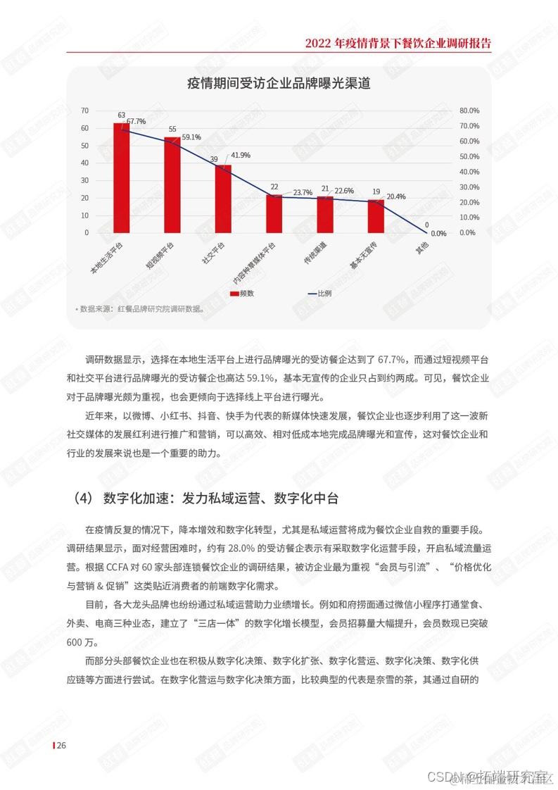 调研数据显示,选择在本地生活平台上进行品牌曝光的受访餐企达到了67.7%,而通过短视频平台和社交平台进行品牌曝光的受访餐企也高达59.1%,基本无宣传的企业只占到约两成。