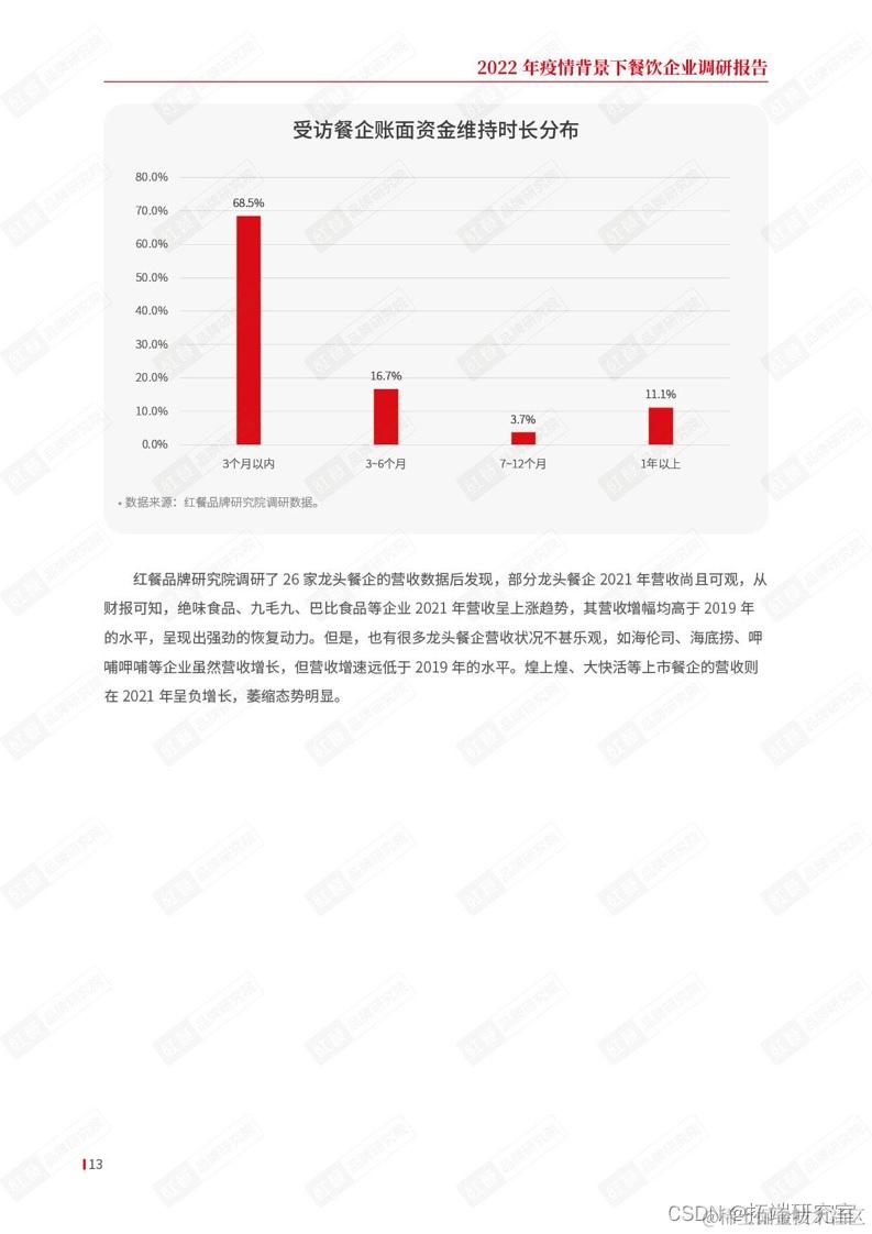 餐饮业作为一个高度依赖现金流的行业,如果企业经营持续低迷,或将面临资金链断裂的危机,从而出现无法支付租金、员工工资、供应商货款等一系列的问题,继而波及餐饮产业的上下游链条。本次调研发现,约有68.5%的受访企业表示目前的账面资金仅能维持近3个月的经营。