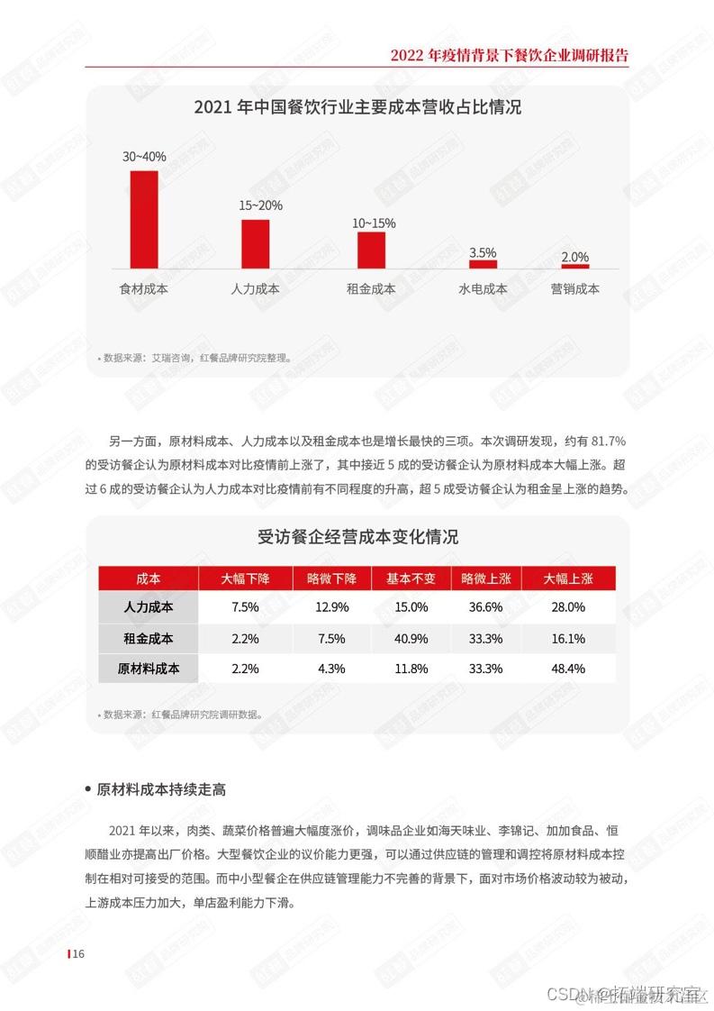 原材料成本、人力成本以及租金成本是餐企成本结构中增长最快的三项。本次调研发现,约有81.7%的受访餐企认为原材料成本对比疫情前上涨了,其中接近5成的受访餐企认为原材料成本大幅上涨。