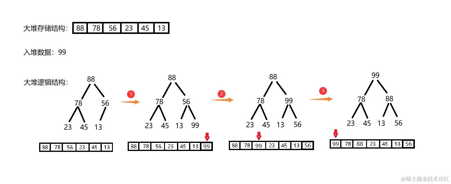 - 这里采用的入堆方式是现将入堆数据先放在堆存储数据最尾部的后一个位置
