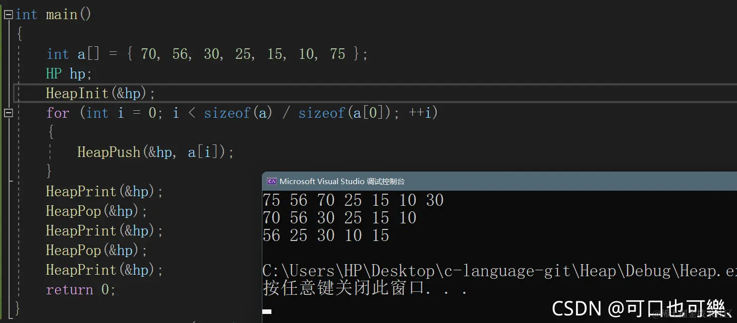 - 交换后让记录存入数据的变量减减,实现删除堆顶数据