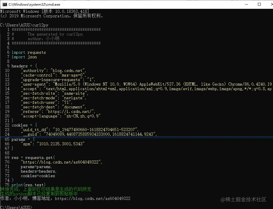 再执行命令将剪切板中curl请求命令转换为python代码(这里借用作者的windows下的方式):