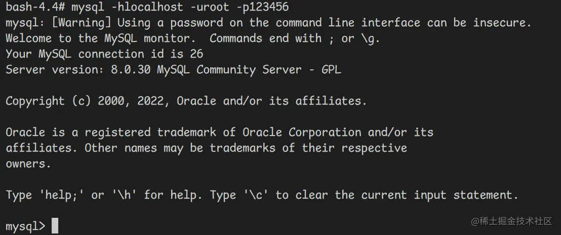 bash-4.4# mysql -hlocalhost -uroot -p123456