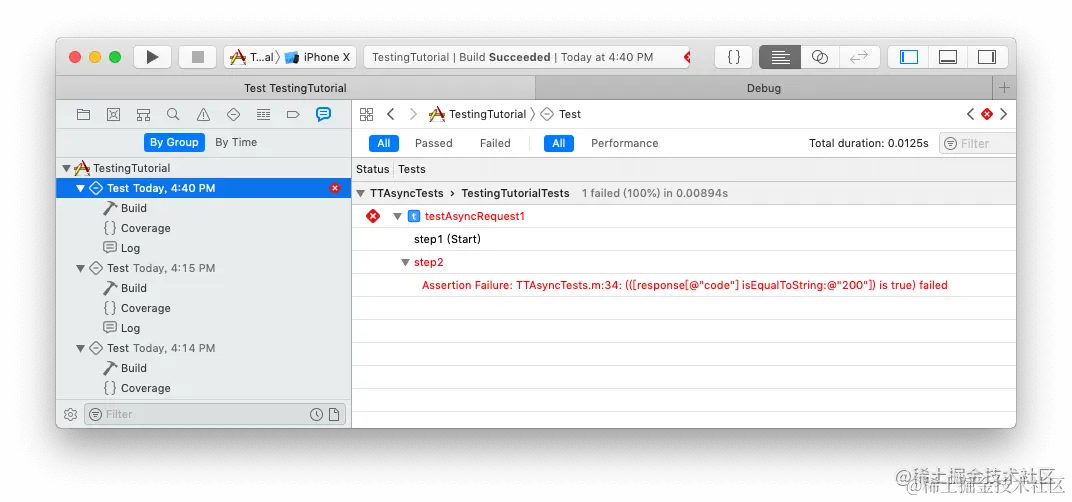 XCTestExpectation设置期望,waitForExpectationsWithTimeout设置异步等待时间,fulfill履行期望,将期望应用到整个异步方法- (void)testAsync { self.vc = [ViewController new]; // 设置期望 XCTestExpectation *ec = [self expectationWithDescription:@"没有达到期望"]; // 调异步方法 [self.vc loadData:^(id data) { // 做断言 XCTAssertNotNil(data); // 将期望应用在整个异步 [ec fulfill]; }]; // 设置容许等待时长 [self waitForExpectationsWithTimeout:2 handler:^(NSError * _Nullable error) { NSLog(@"error = %@",error); }]; } - 异步返回用时超过预设时间则会FAILD