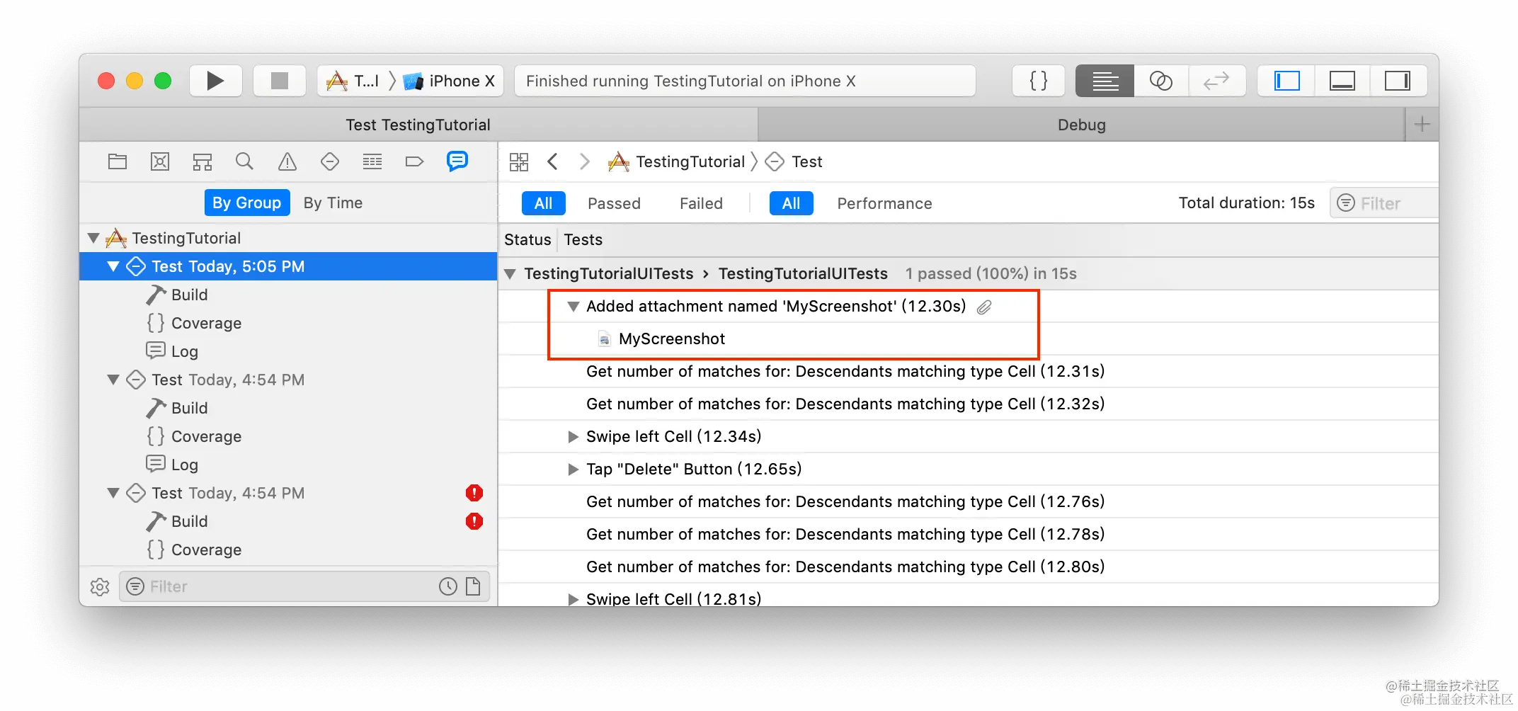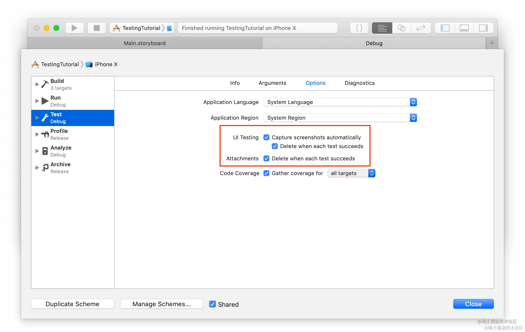 除此之外 Xcode 提供了自动截图的功能,可以帮助我们在每一个交互操作之后自动截图;此功能会产生大量截图,需要谨慎使用,一般情况最好勾选Delete when each test succeeds,需要在 Edit Scheme --> Test --> Options 中开启