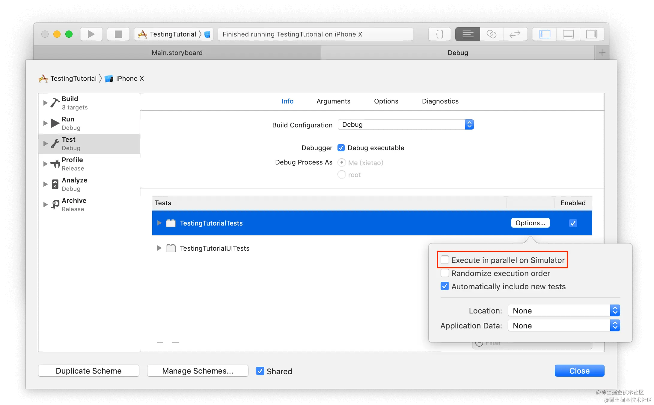 并行测试可以同时进行多个测试,从而节省大量时间。在测试时会启动多个模拟器,模拟器之间的数据都是隔离的,可以在 Edit Scheme -> Test -> Info -> Tests -> Options 中开启该功能