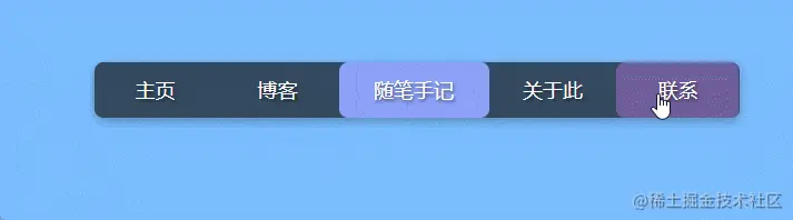 但是,对于hover来说,菜单按钮元素被点击.active,浅色背景元素的设置也在生效,如果其菜单按钮前面的按钮被hover,由于浅色背景元素位置和大小已经指定,并且样式设置位于后面,将会覆盖前面hover的样式,即不会生效。