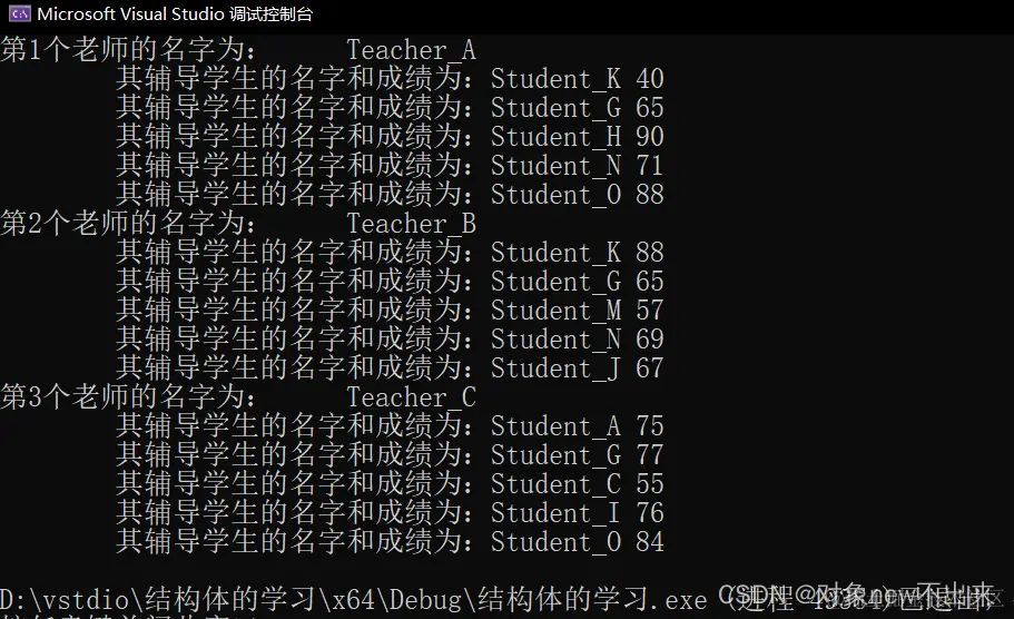 cout << "\t其辅导学生的名字和成绩为:" << T[i].s[j].name << " " << T[i].s[j].score << endl;