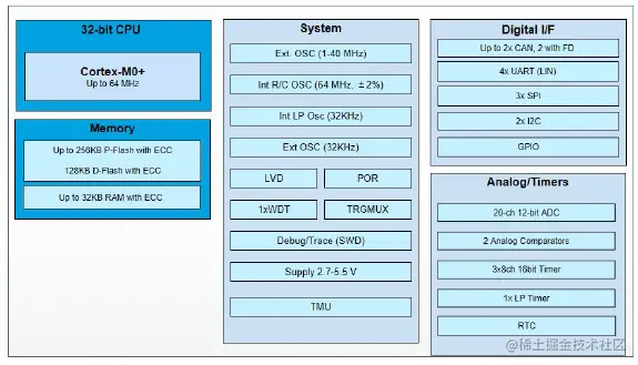 - 高集成度:ADC/DAC/DMA/CAN/LIN/USART/USB/AMP/CMP/CFGL(可编程逻辑门单元)