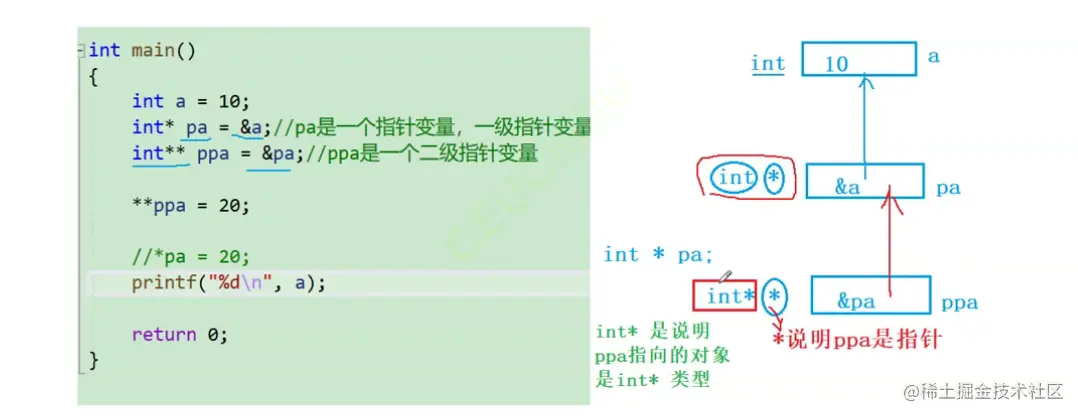 ✔二级指针主要存放的是一级指针变量的地址