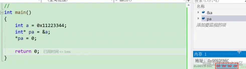 可知四个字节均发生改变,int* 整型指针解引用时访问四个字节