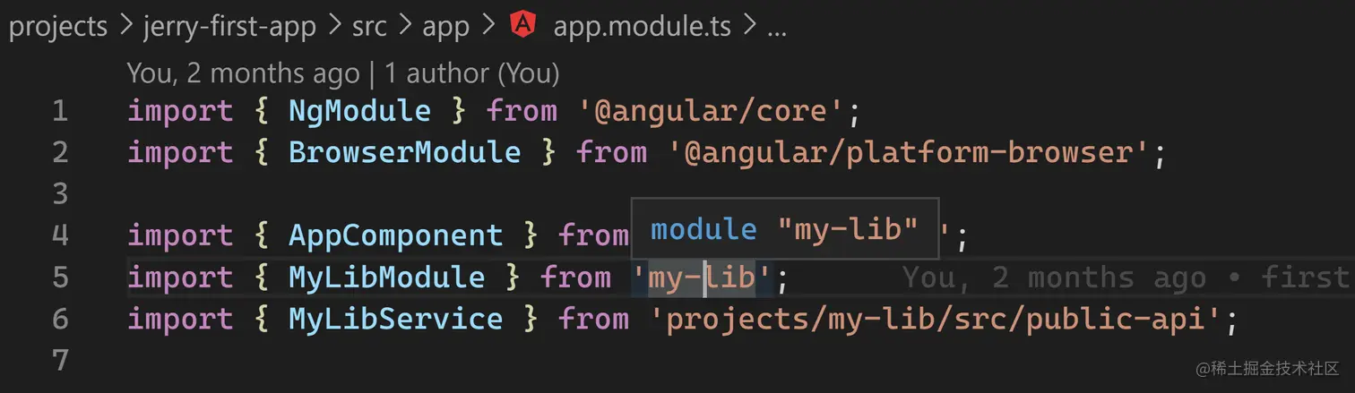 我们在 Visual Studio Code 里查看 my-lib,鼠标 hover 上去,能看到 module "my-lib" 的提示: