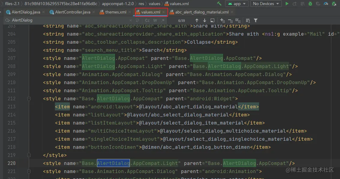 搜索源码 values.xml 文件,搜索 AlertDialog, 查找到下面的的位置。