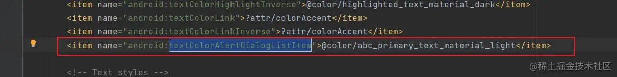点击上面的资源会跳转到下面的位置 ,这里可以看到一个name 为 textColorAlertDialogListItem 的资源,在这个文件中,查找这个name ,