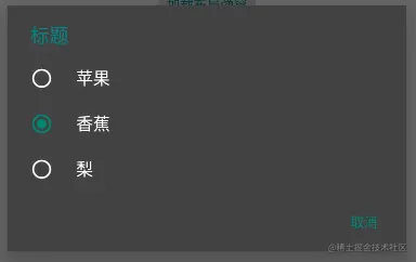 不知道大家有没有发现,上面的弹窗跟前面几个不一样的,它是动态加载的,里面的内容可以根据需求动态增加,这种动态变化的,如果我要修改苹果、香蕉这些文字的颜色是白色时,前面的几种方式中,第一种是很难进行修改的,这个是动态变化的也不是直接在xml 上写死能解决的。第二种也是可以的,就是载入style样式后,弹窗并没有官方的那么美观,如果你能写成一模一样,那当我没说。通过放射机制修改,也是可以,就是我试了一下,没找到怎么改(好吧,是我太菜!)。
