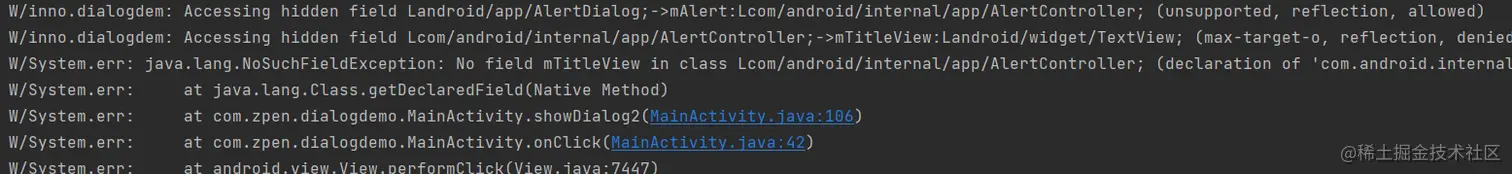 我查看了log ,发现有报错,大概就是因为无法通过反射机制找到对于的对象,所以并没有修改样式成功,那是不是说这个方法不可行呢,并不是,我简单查找了一下原因,怀疑是本地的环境有冲突,存在多个AlertDialog.java 这个文件的源码,无法精准的找到对应的变量,导致冲突报错了。