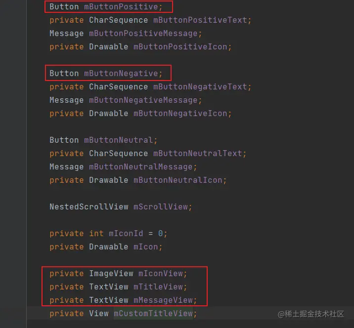 通过同样的方法 查看 AlertController.java 这个文件的代码,查看这个代码可以发现这里声明了一些变量,这些变量就是弹窗的组成,通过变量名能够大概知道它代表着什么东西。
